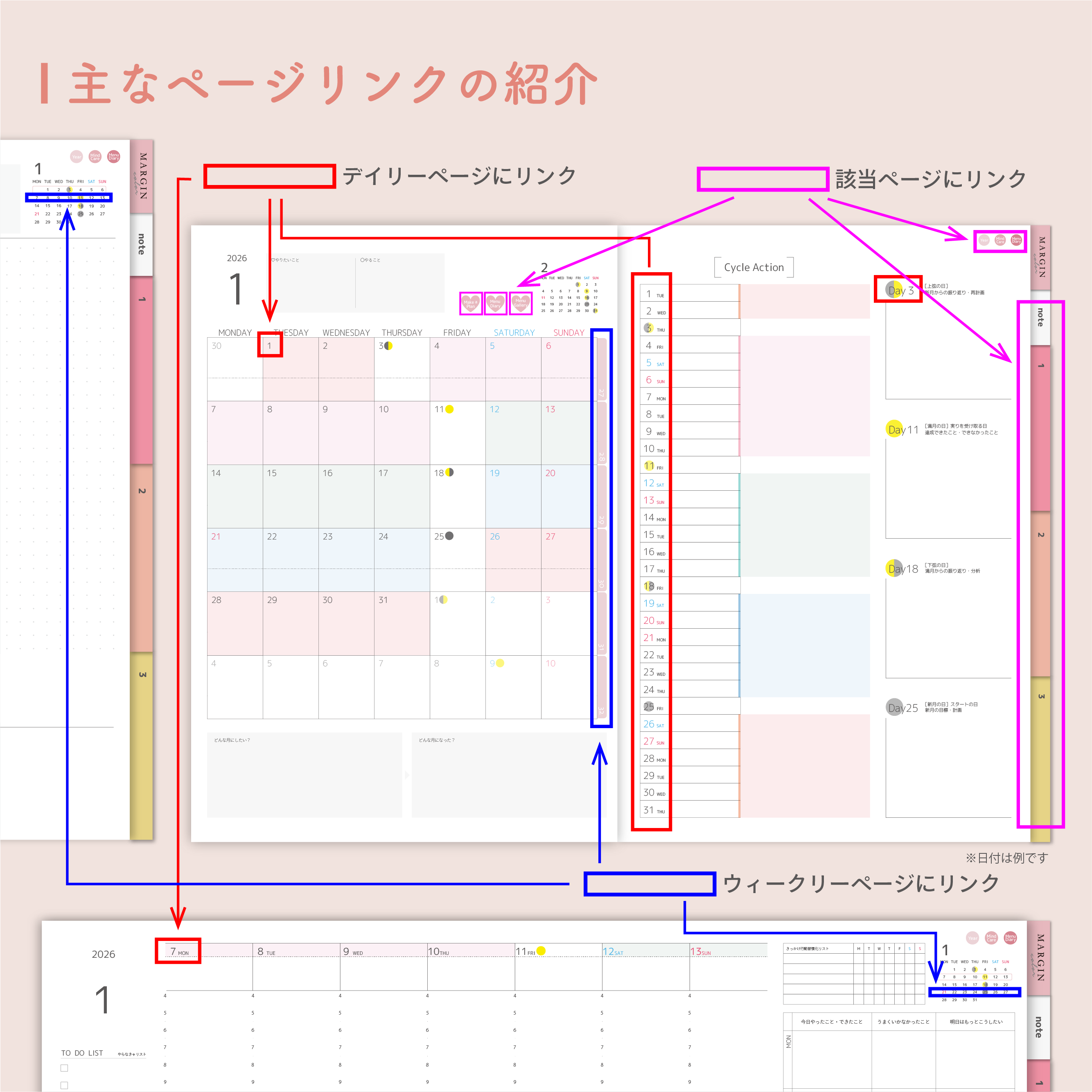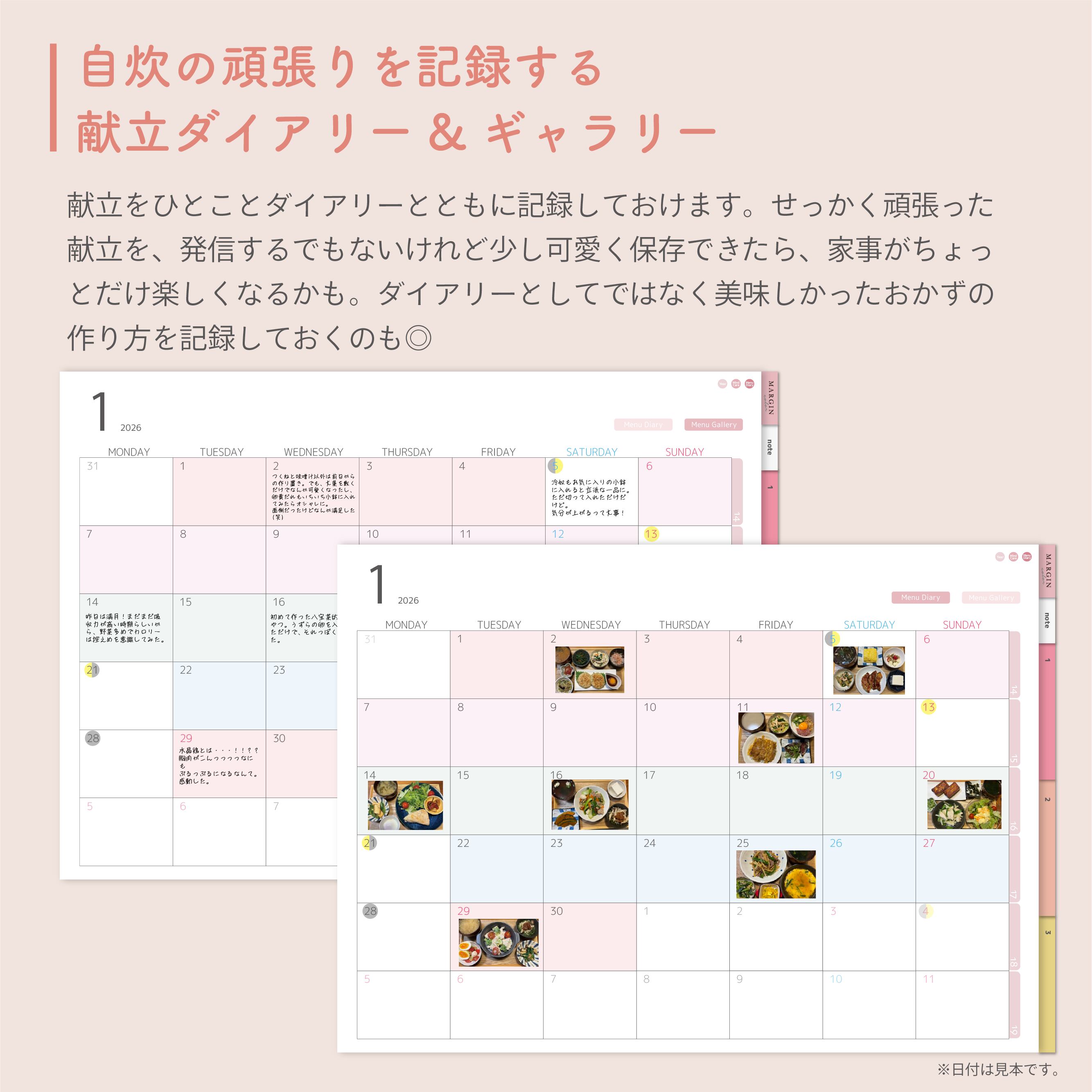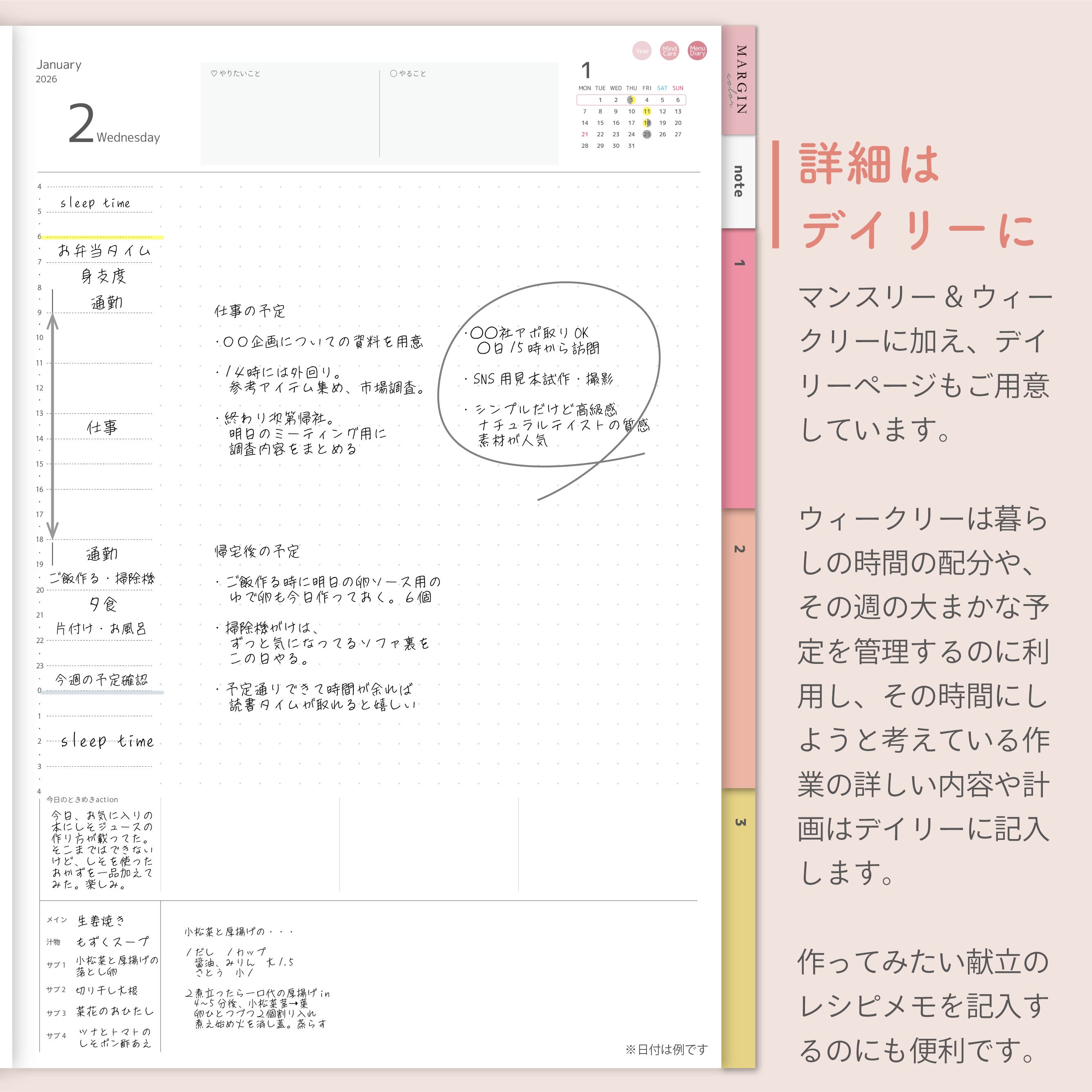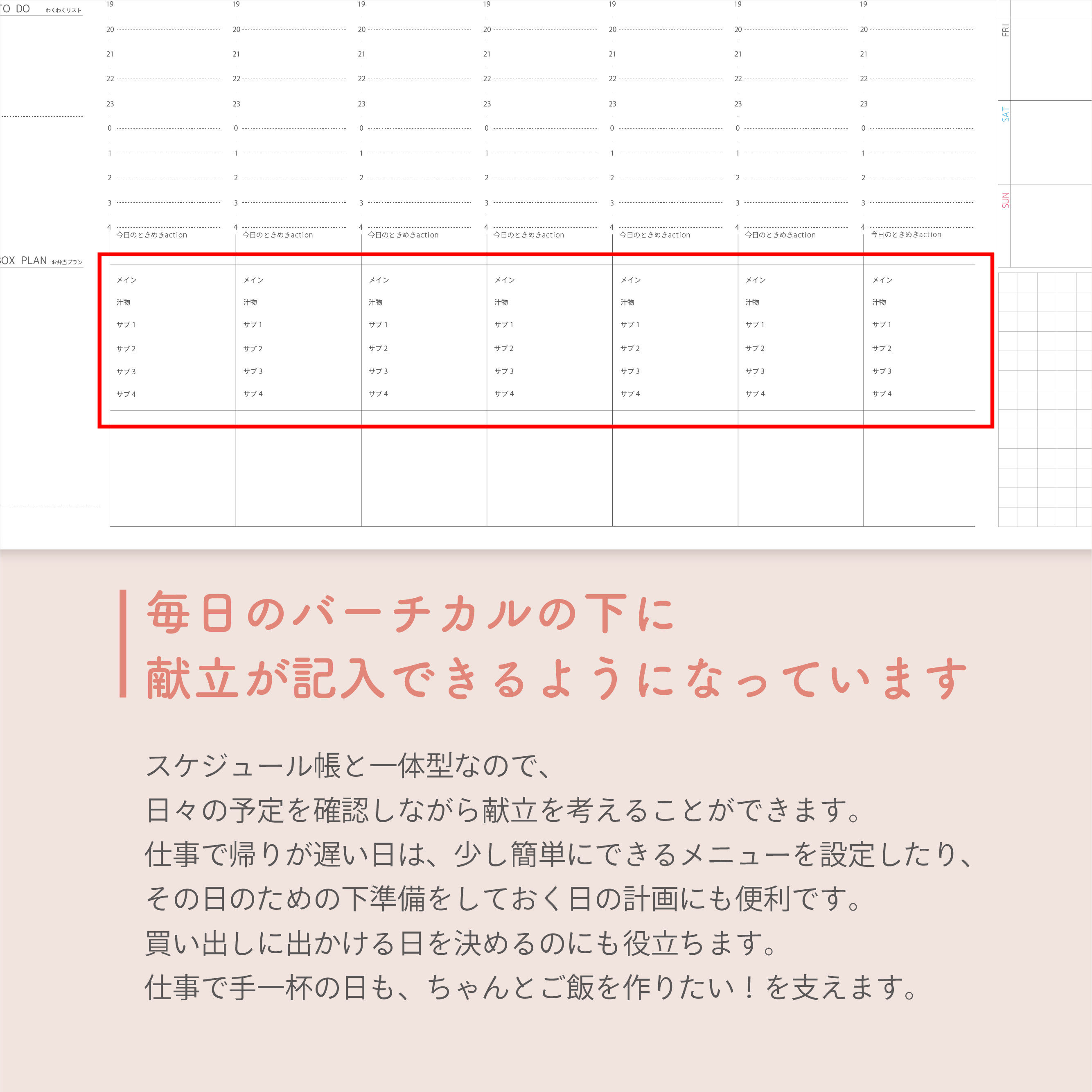 MARGINcolorはスケジュール帳と献立帳が一体化した手帳なので、自分の仕事や、家族の予定も同時に確認しながら全てまるっと計画できます。