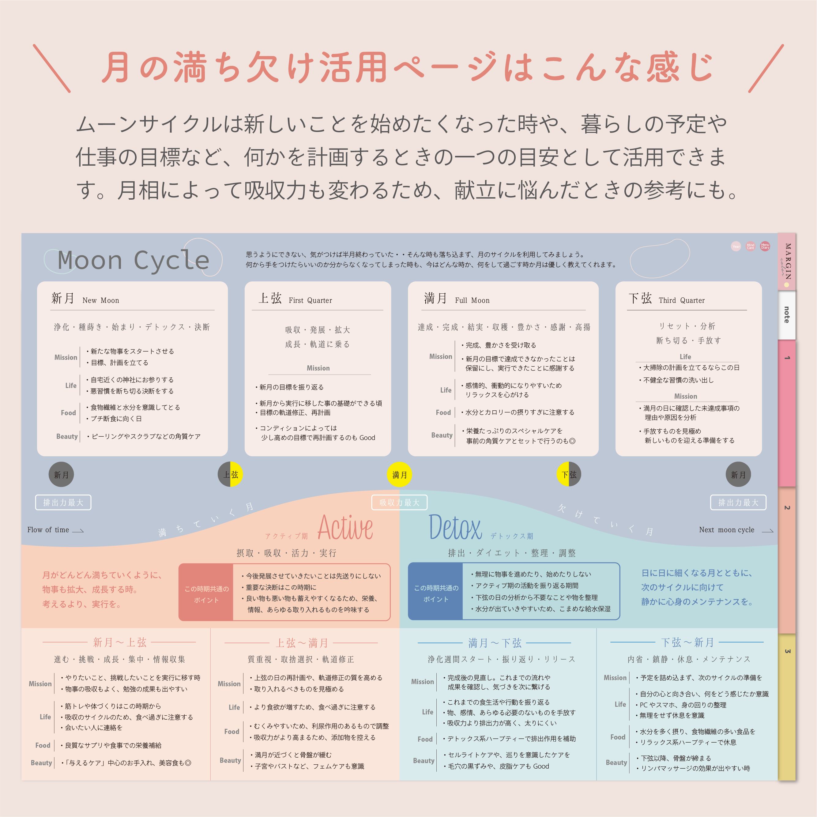 全体が月の満ち欠けを利用した作りになっており、やる気が出ない時やうまくいかない時も、「今はそういう時なんだ」と思えたり、やりたいことややることが多く、何から手をつけていいか分からなくなった時のヒントにしてもらえるよう工夫しています。