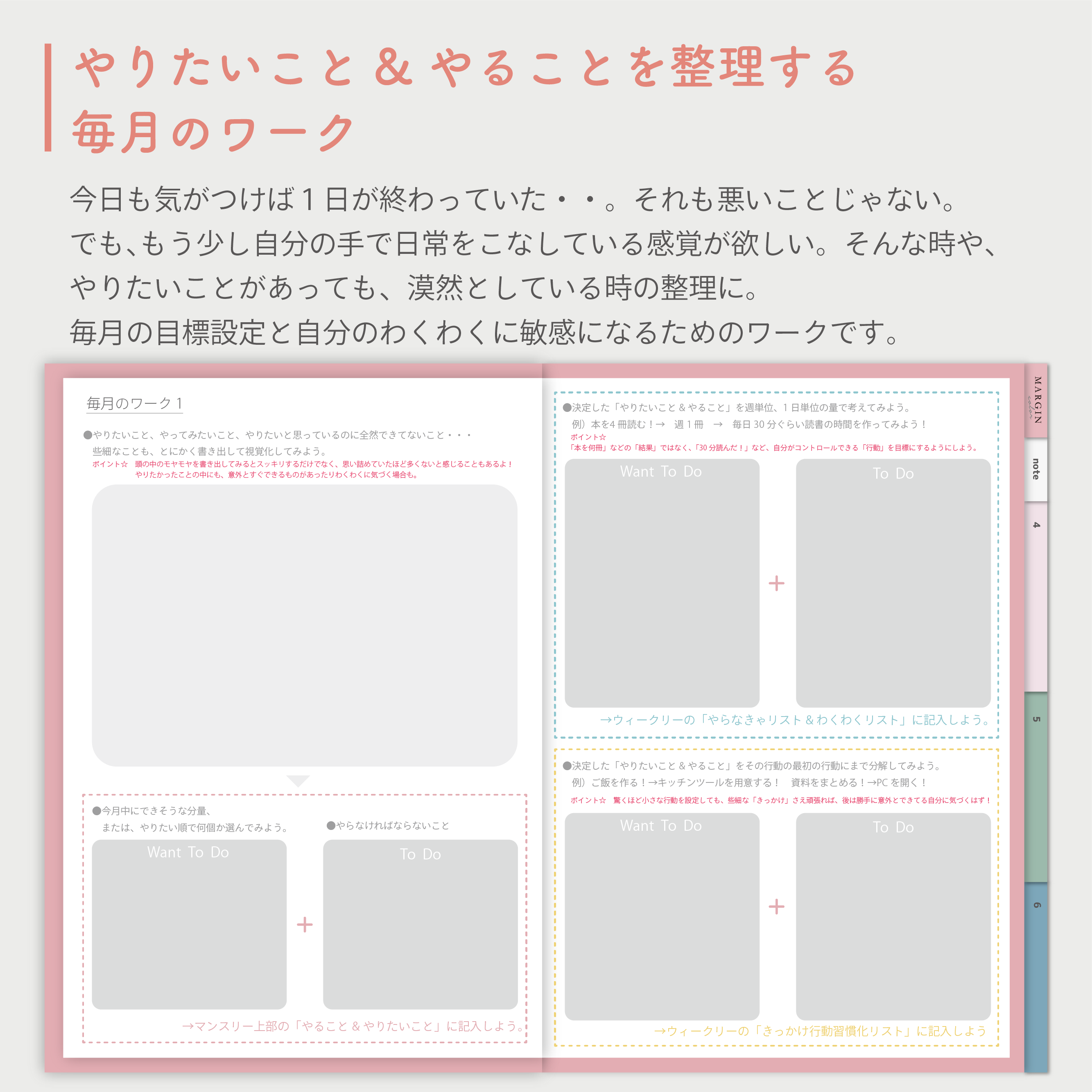 手帳の項目を埋めていくだけで、自然とやる気が出たり、前向きになれる手帳を目指しています。