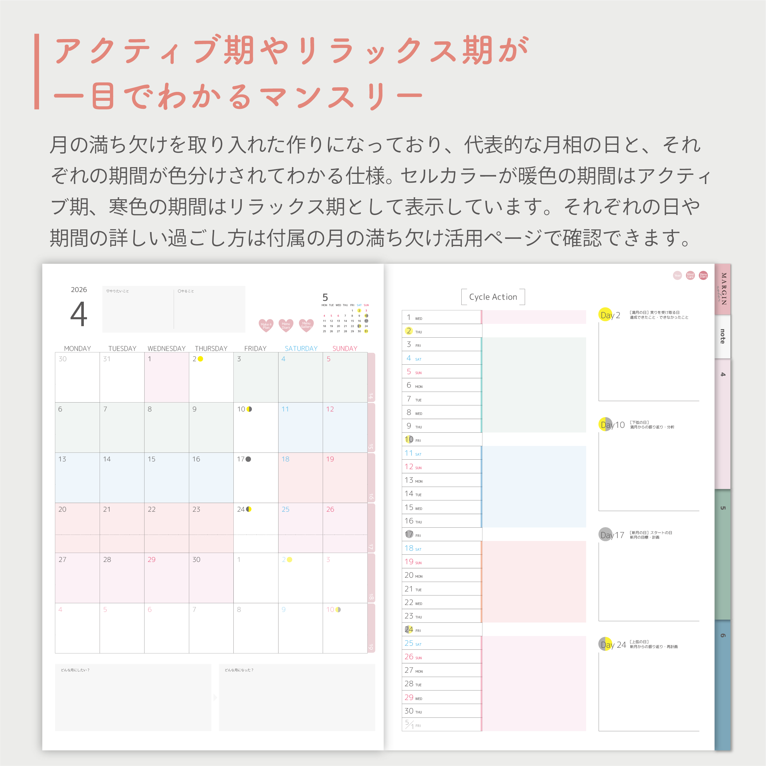 全体が月の満ち欠けを利用した作りになっており、やる気が出ない時やうまくいかない時も、「今はそういう時なんだ」と思えたり、やりたいことややることが多く、何から手をつけていいか分からなくなった時のヒントにしてもらえるよう工夫しています。
