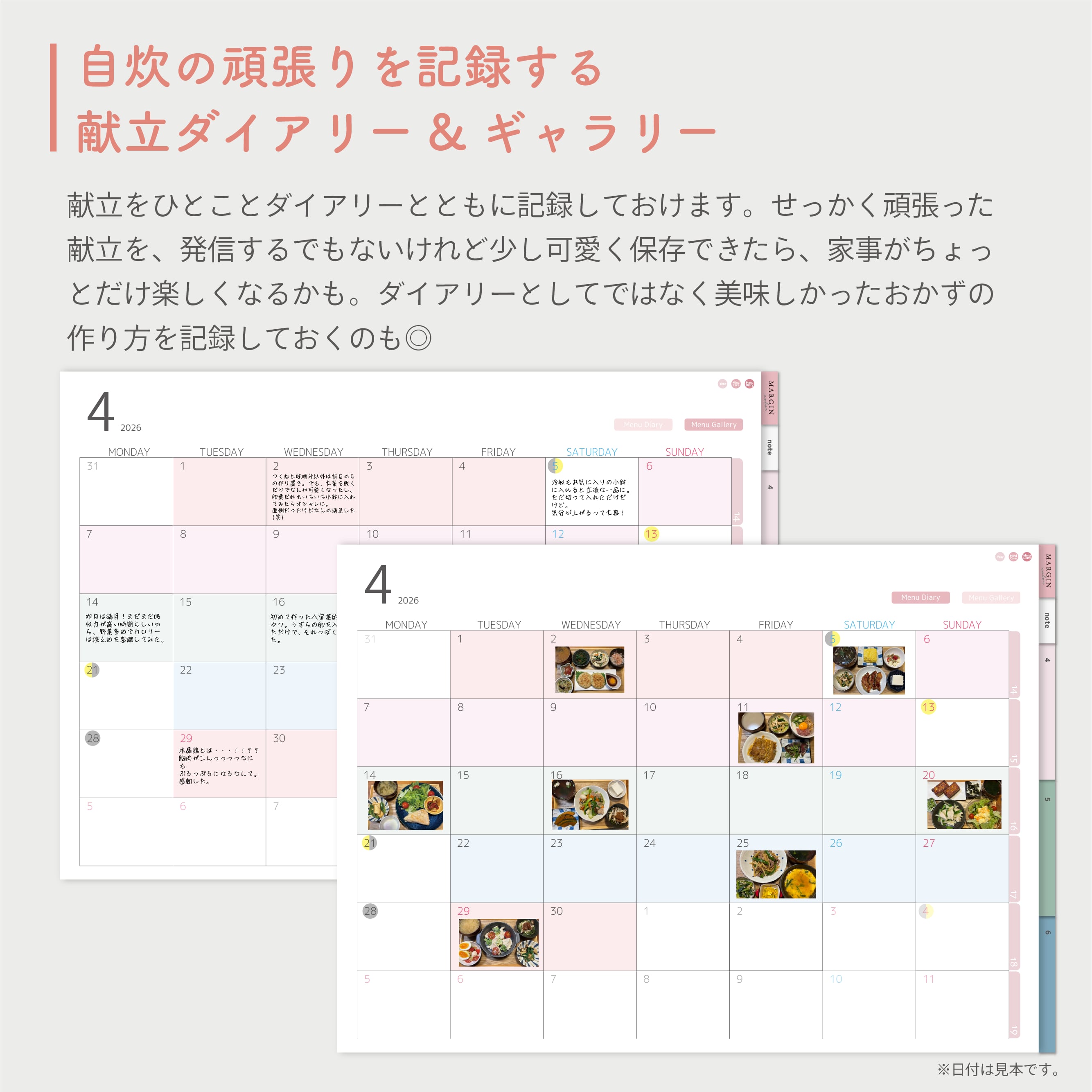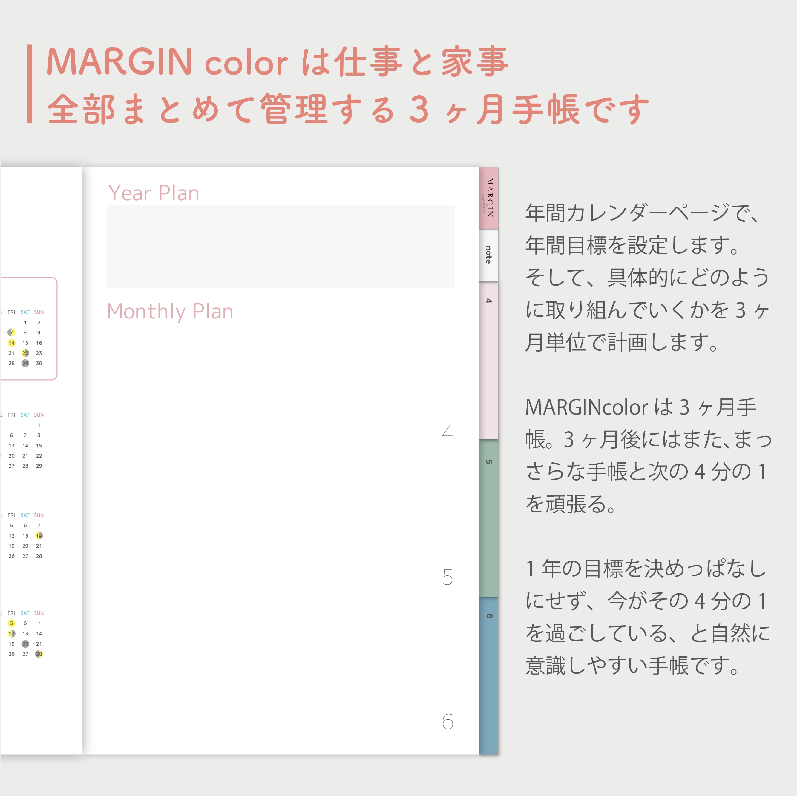 MARGINcolorはスケジュール帳と献立帳が一体化した手帳なので、自分の仕事や、家族の予定も同時に確認しながら全てまるっと計画できます。